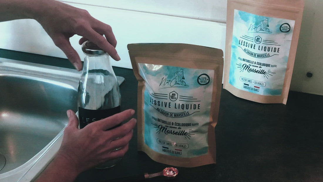 Versez la poudre Nat’Clean dans une bouteille avec de l’eau chaude. Secouez doucement pour bien dissoudre la poudre et obtenir votre lessive liquide naturelle, prête à l’emploi.
